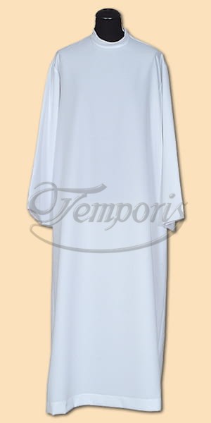Alba kapłańska biała prosta ze stójką, zamek na ramieniu.