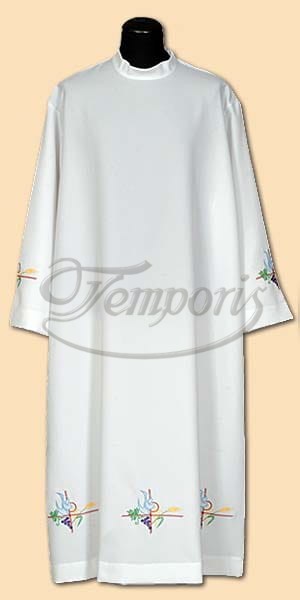 Alba kapłańska biała prosta ze stójką, zamek na ramieniu.