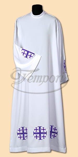 Alba kapłańska biała prosta ze stójką, zamek na ramieniu.