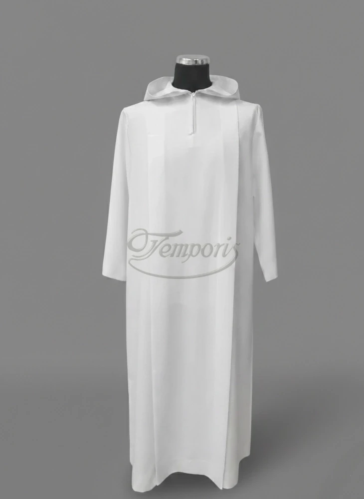 Alba lektorska biała rzymska zakładka z kapturem, zamek z przodu.