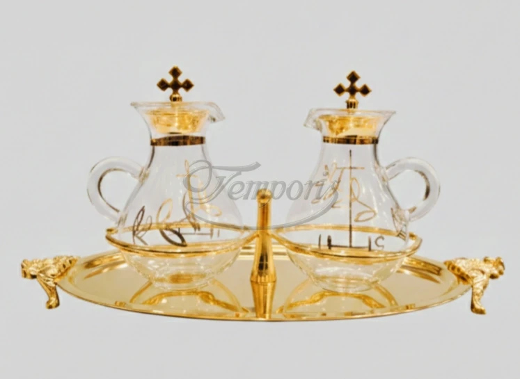 Ampułki zdobione złotym ornamentem z pozłacaną tacką z uchwytami.