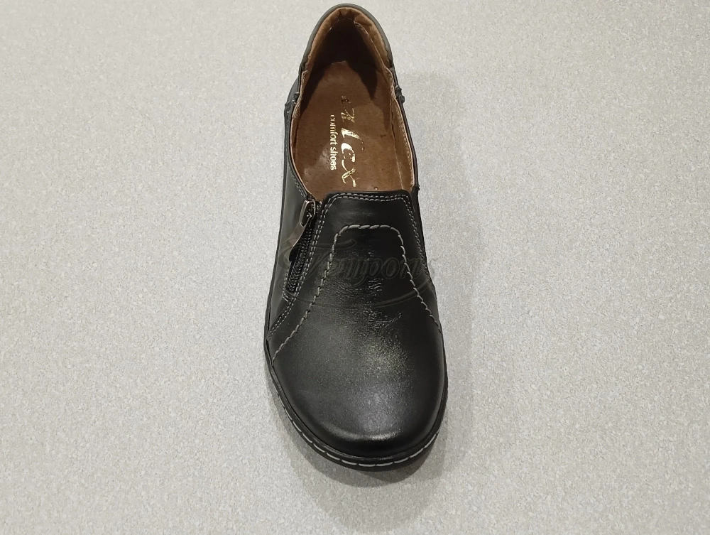 Półbuty damskie, czarne z suwakiem z boku na płaskiej podeszwie.