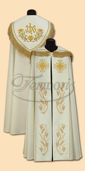 Kapa kapłańska z haftem z przodu i na kapturze.