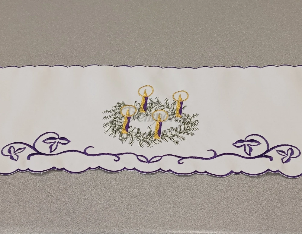 Wzór adwentowy został wyhaftowany maszynowo na tkaninie obrusowej (100% poliester).