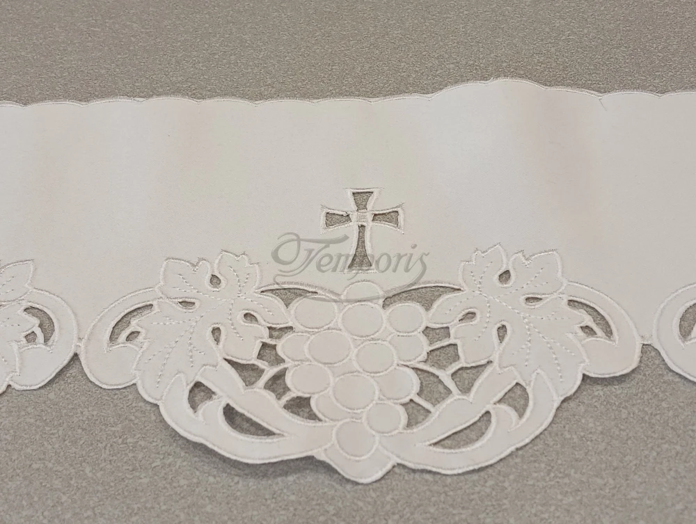Wzór liturgiczny został wyhaftowany maszynowo na tkaninie obrusowej (100% poliester).