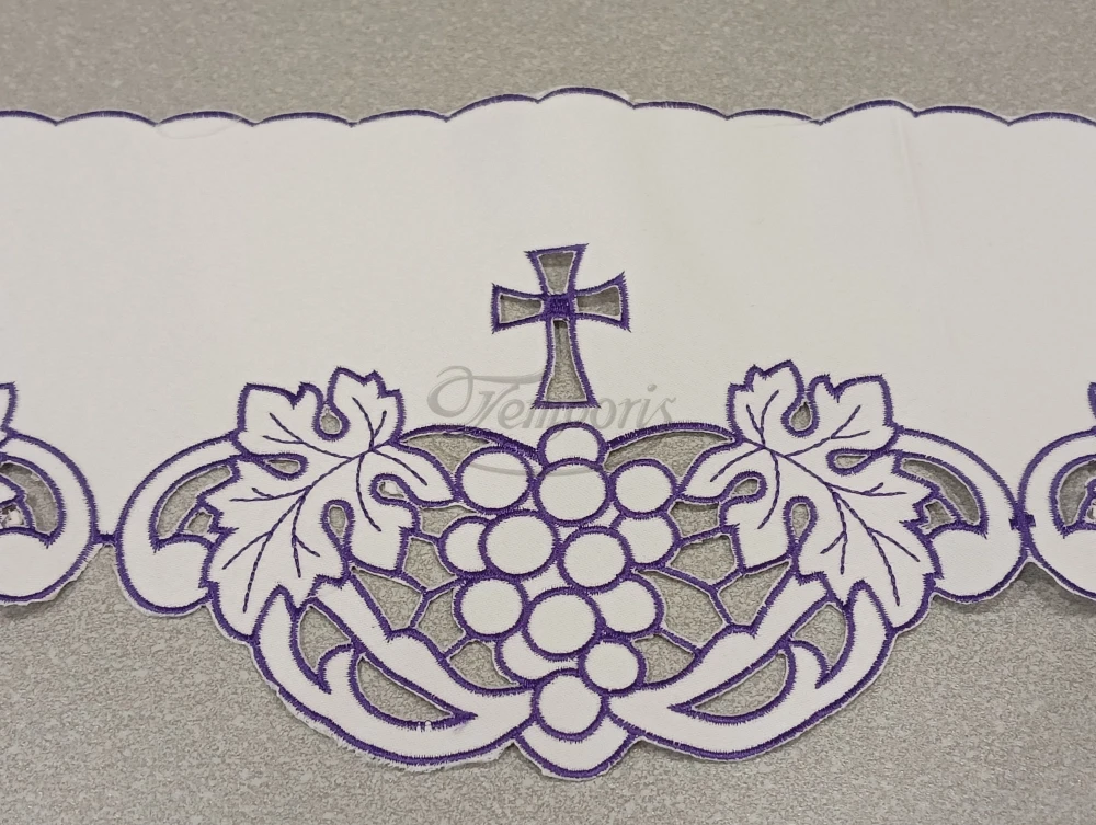 Wzór liturgiczny został wyhaftowany maszynowo na tkaninie obrusowej (100% poliester).