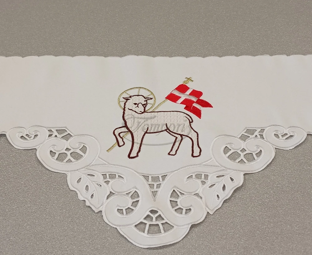 Wzór wielkanocny został wyhaftowany maszynowo na tkaninie obrusowej (100% poliester).