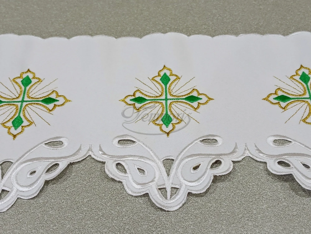 Wzór liturgiczny został wyhaftowany maszynowo na tkaninie obrusowej (100% poliester).