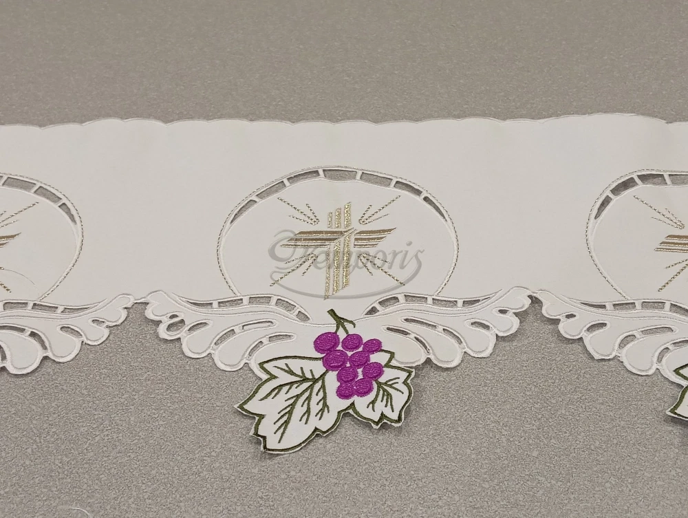 Wzór liturgiczny został wyhaftowany maszynowo na tkaninie obrusowej (100% poliester).
