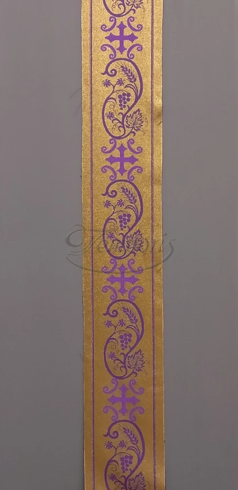 Pas szeroki, fioletowy z tkaniny poliestrowej tkany złotymi nićmi metalizowanymi.