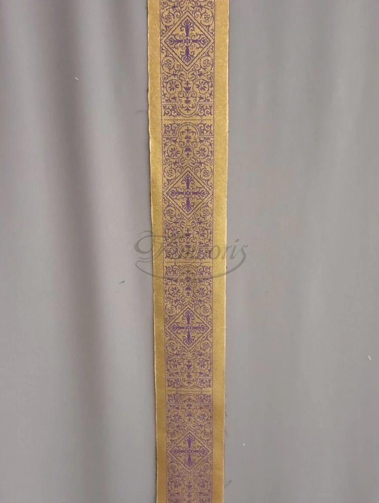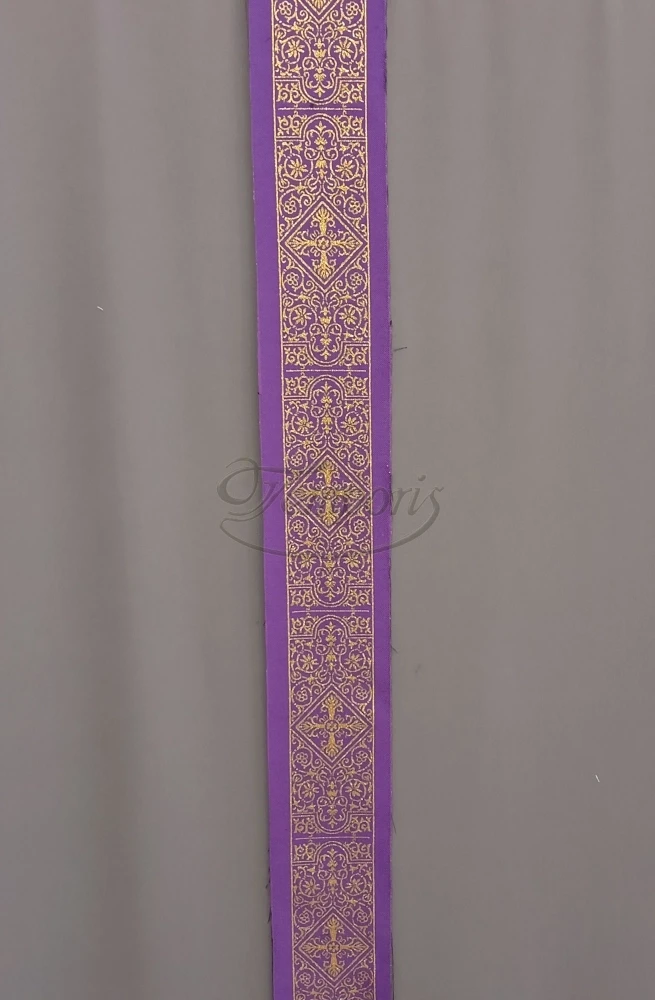 Pas wąski, fioletowy z tkaniny poliestrowej tkany złotymi nićmi metalizowanymi.
