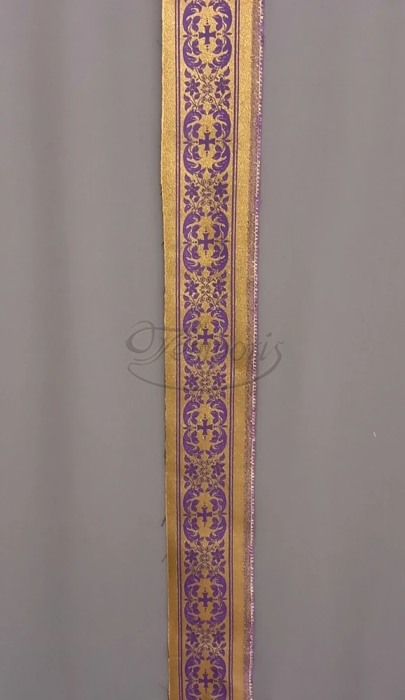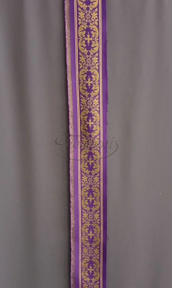 Pas wąski, fioletowy z tkaniny poliestrowej tkany złotymi nićmi metalizowanymi.
