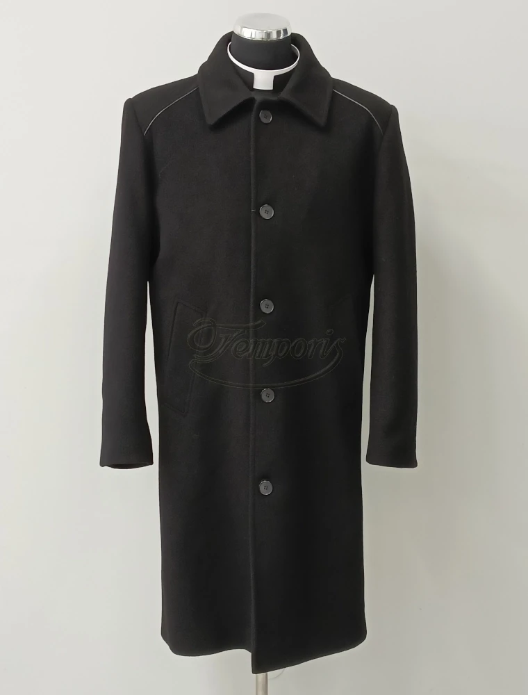 Płaszcz męski zapinany na guziki pod szyję z kołnierzykiem.