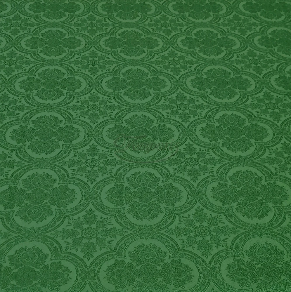 Tkanina żakardowa z widocznym ornamentem rozetowym.