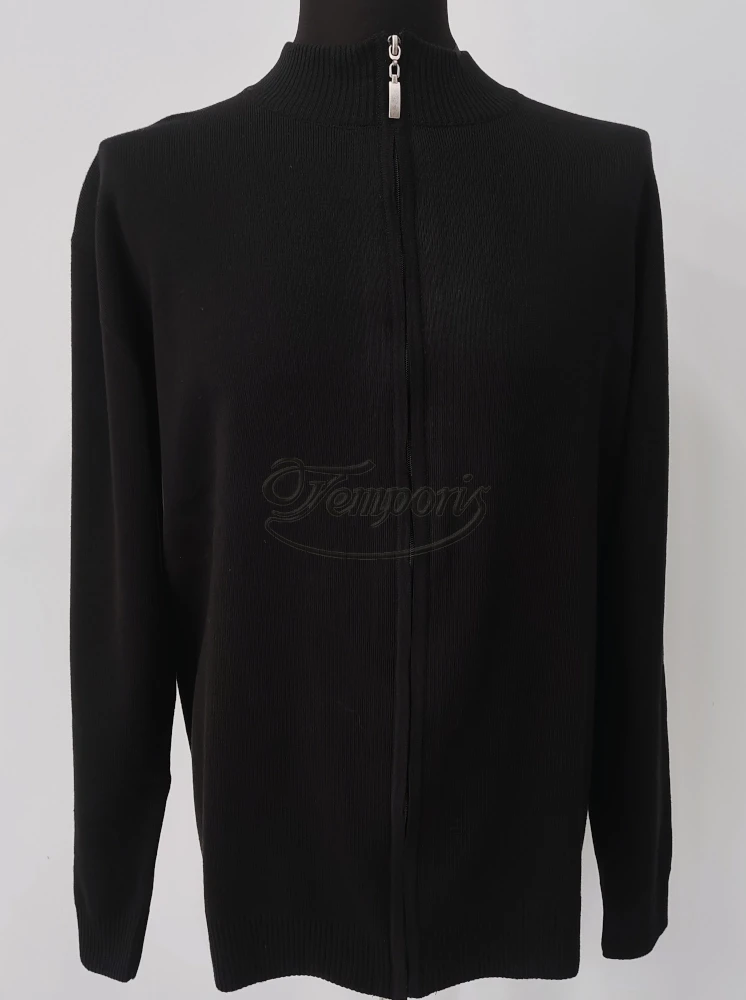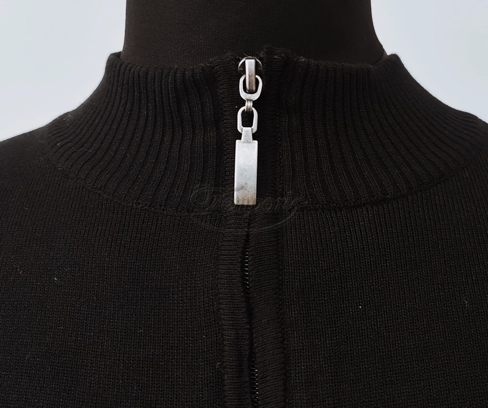 Czarny sweter ze stójką, zapinany na zamek.