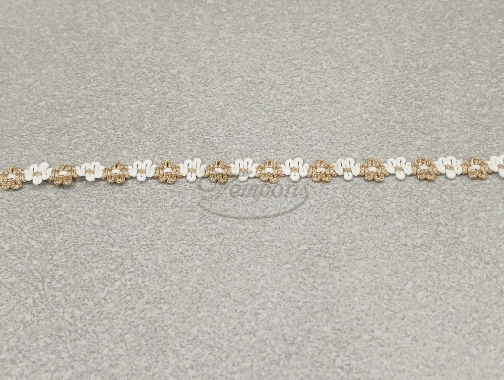 Ozdobna tasiemka dziana z motywem kwiatowym w kolorze biało-miodowym wykonana z polipropylenu.