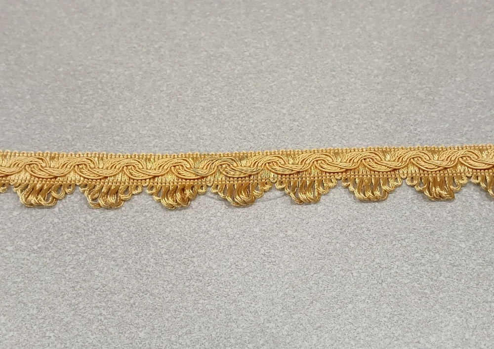 Ozdobna taśma dziana w kolorze miodowym wykonana z poliestru.