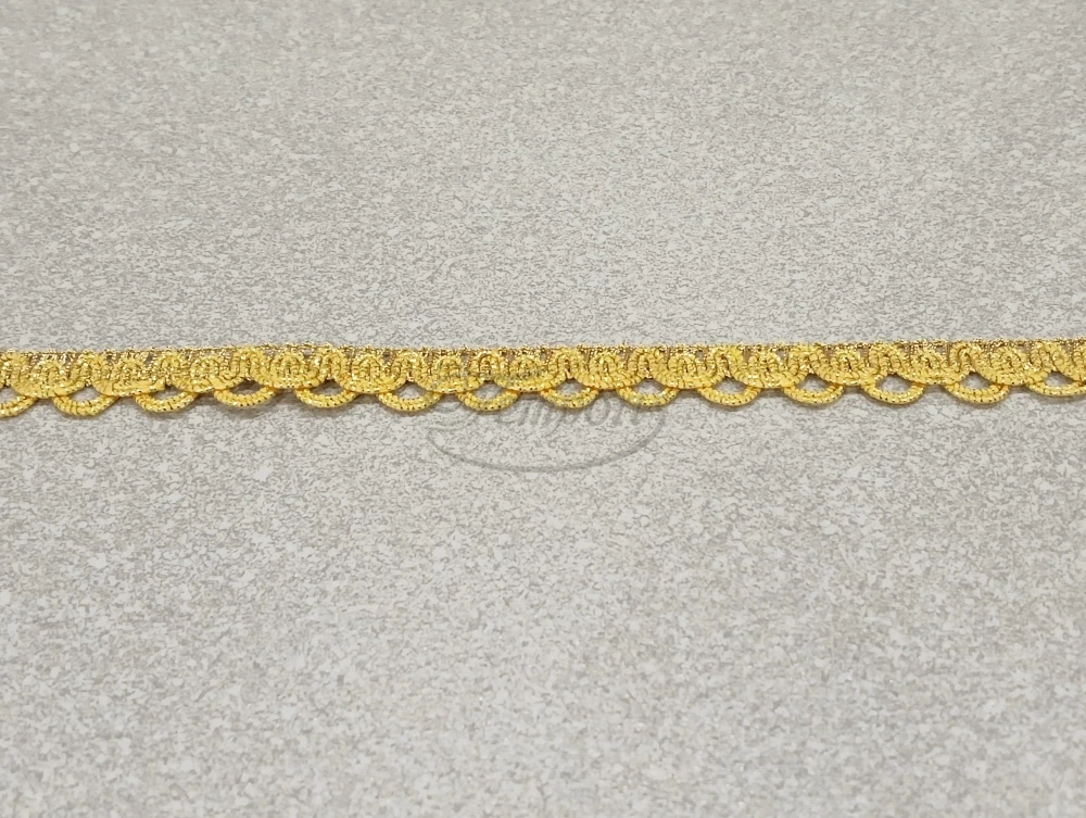 Ozdobna tasiemka wykonana z przędzy wiskozowej oplecionej złotą folią metalizowaną.