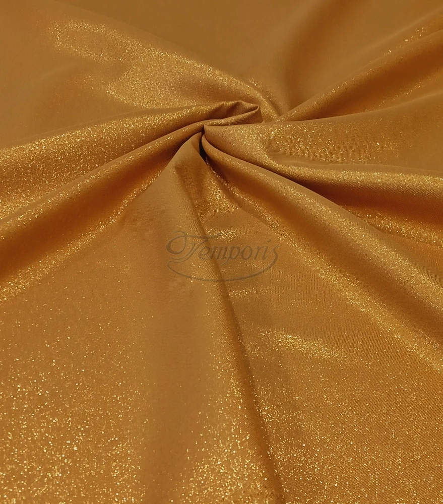 Tkanina poliestrowa przetykana nićmi metalizowanymi.