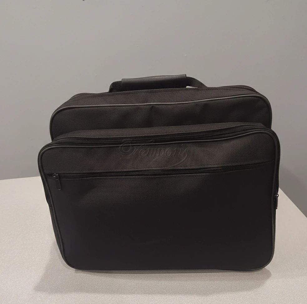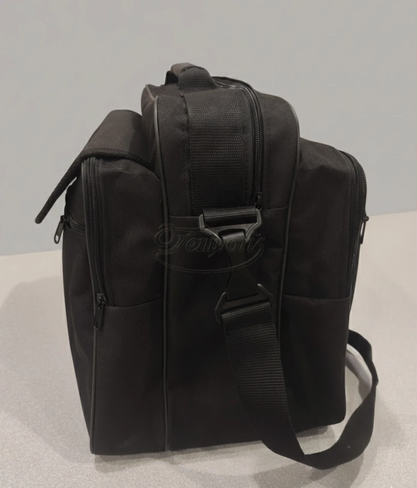 Trójsekcyjna torba z rączką i odpinanym, regulowanym paskiem.